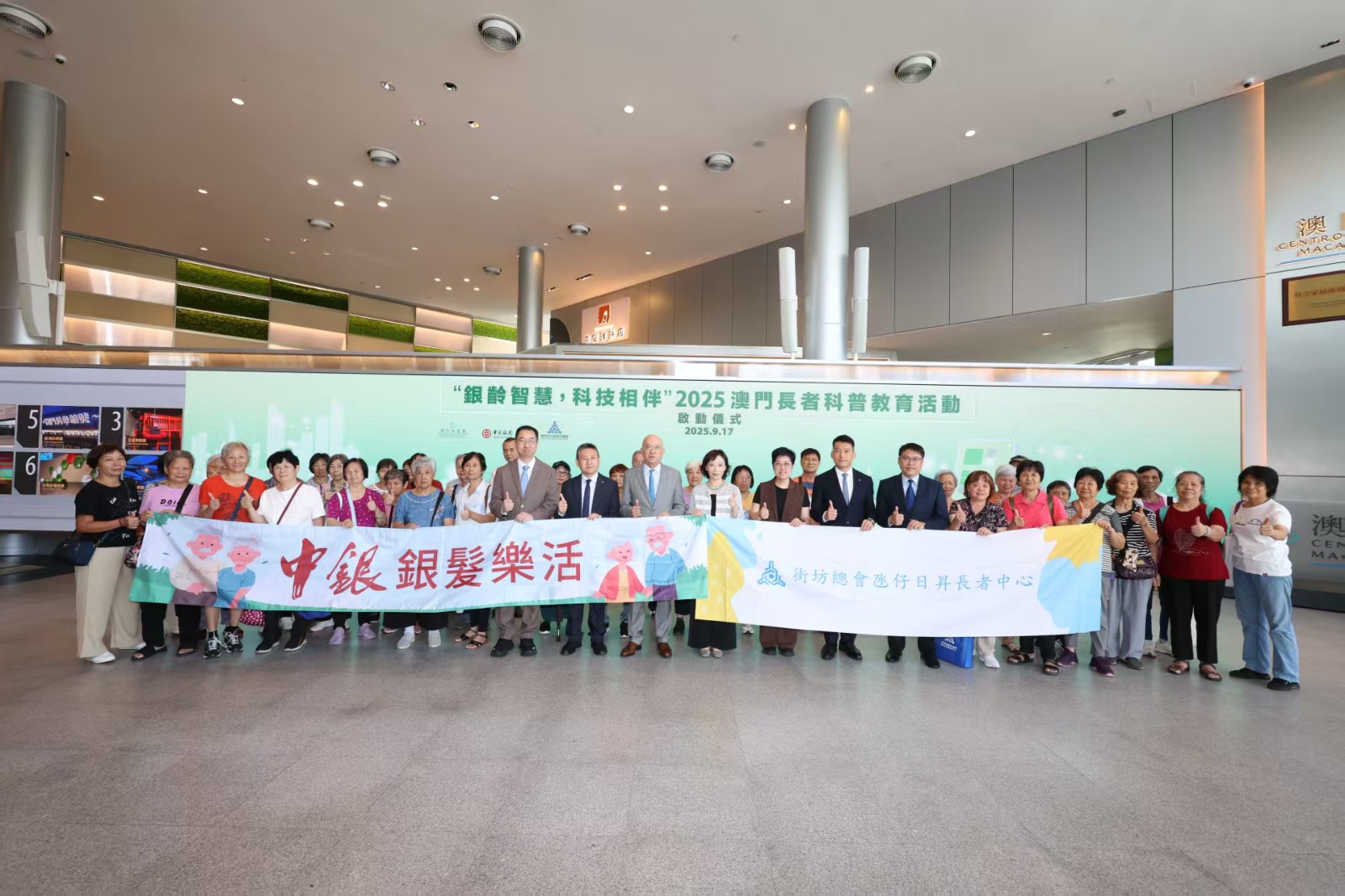 The launch ceremony of the event took place on the morning of September 17 at the lobby of the Macao Science Center (MSC), with notable attendees including Dr. Mok Ian Ian, President of the Board of Directors of Macao Science Center Limited; Mr. Chan Weng Tat, Vice President of Bank of China (Macau) Limited; Ms. Ng Siu Lai, President of the General Union of Neighborhood Associations of Macao (UGAMM); Mr. Leong Sai Kun, General Manager of the Banking Center of BOC Macau Branch; Mr. Wong Hio Keong, General Manager of BOC Macau Branch Ko Si Tak Sub-branch; Dr. Sio Hon Pan, the Curator of Macao Science Center; and U Hon Sang, a member of the Board of Directors of Macao Science Center Limited.