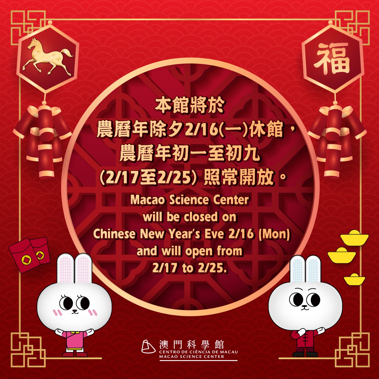To celebrate the Chinese New Year, Macao Science Center will resume normal operations from February 17 to 25 and will only be closed on Chinese New Year’s Eve (February 16). In February, the Center will launch a series of Chinese New Year activities, including the exhibition “Deep Sea Garden”, the “Starry Night - Drone Astrophotography” lecture, the brand-new full-dome movie “Horse Power”, as well as several science popularization workshops and online prize games, bringing a rich Chinese New Year science popularization experience to both residents and visitors.