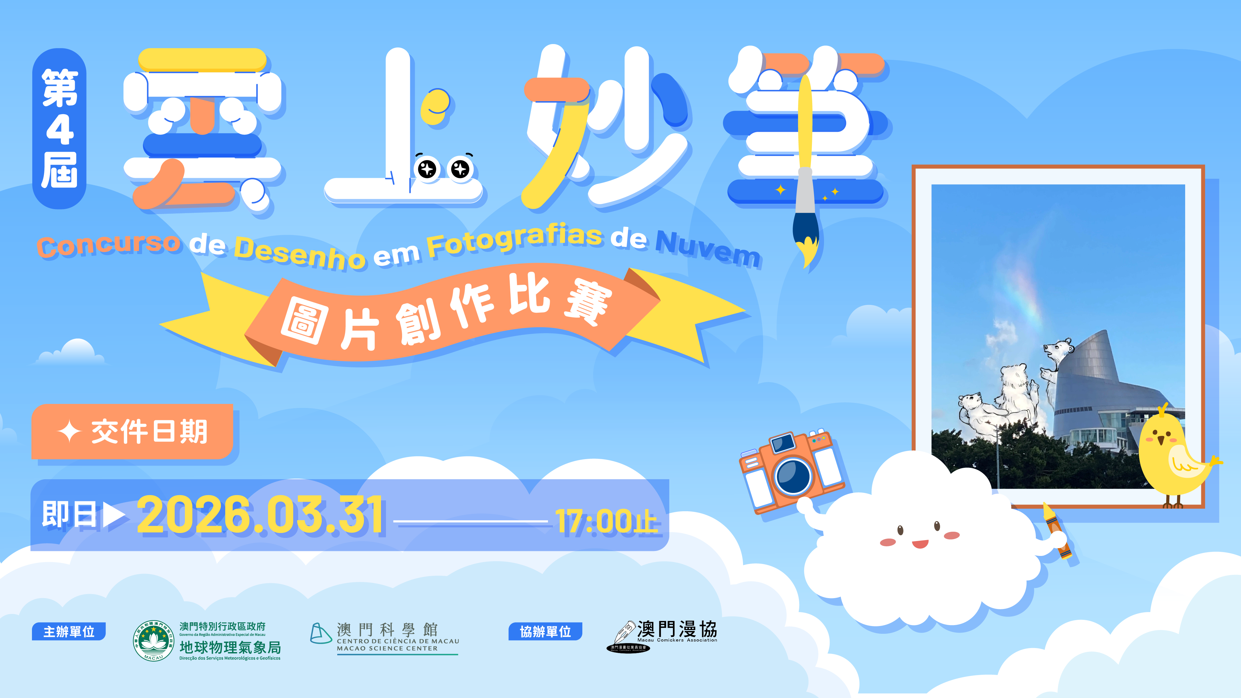 為推動氣象科普教育,地球物理氣象局與澳門科學館合辦、澳門漫畫從業員協會協辦第4屆“雲上妙筆圖片創作比賽”,藉以提高公眾對天氣的關注和加深對雲種等氣象知識的了解。歡迎合資格人士踴躍參與,並於3月31日下午5時前報名及上載參賽作品。