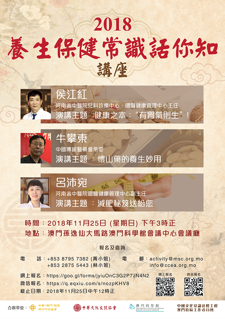 為弘揚中華傳統文化、推廣中醫養生保健理念及提高市民的保健意識,中華(澳門)發展與合作促進會、中華文化交流協會、澳門科學館及中國文化常識達標工程澳門特區工作委員會合辦「2018養生保健常識話你知」講座。
