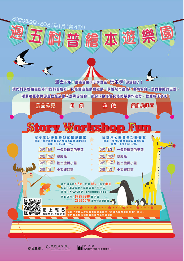 澳門科學館精選四本不同科普繪本,配搭創造性戲劇遊戲,學習城市建築、環境保育等主題,活動著重參與的過程性及個人思辨的培育,部份項目亦會配搭簡單手作進行,歡迎親子參加!