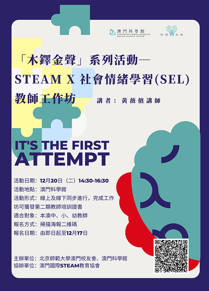 由北京師範大學澳門校友會及澳門科學館聯合主辦,澳門國際STEAM教育協會協辦的「木鐸金聲」系列活動—STEAM X 社會情緒學習(SEL)教師工作坊,將於本月20日下午兩點半至四點半在澳門科學館舉行。自新冠病毒疫情爆發以來,社會各界對青少年兒童的心理健康越發關注。疫情變化為青少年兒童日常生活、學業社交等帶來不同程度的影響,也為他們的心理健康及情緒管理帶來挑戰。因此,在疫情防控常態化下,協助學生培養抗壓力及情緒抗疫力,做好情緒管理成為教育界重要的議題。