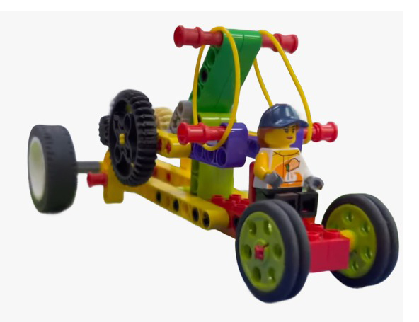 單元二:格蘭披治小賽車(BricQ趣動套件)小車以橡皮筋蓄力為動力,學習能量的儲存和釋放方式;並通過齒輪組控制車輪行駛,學習動力的傳遞。