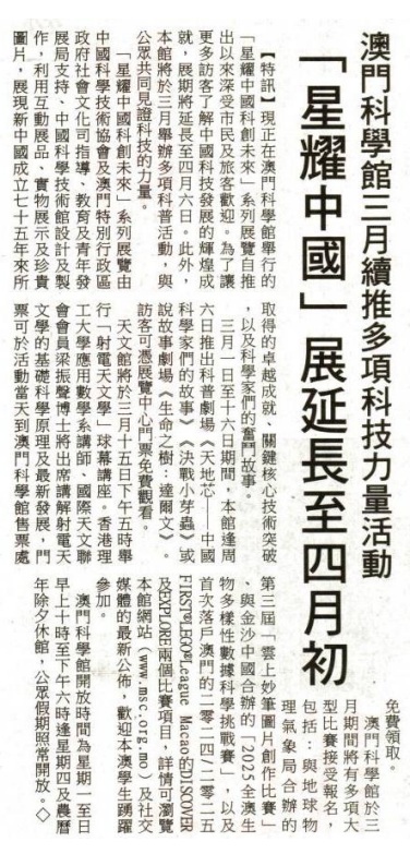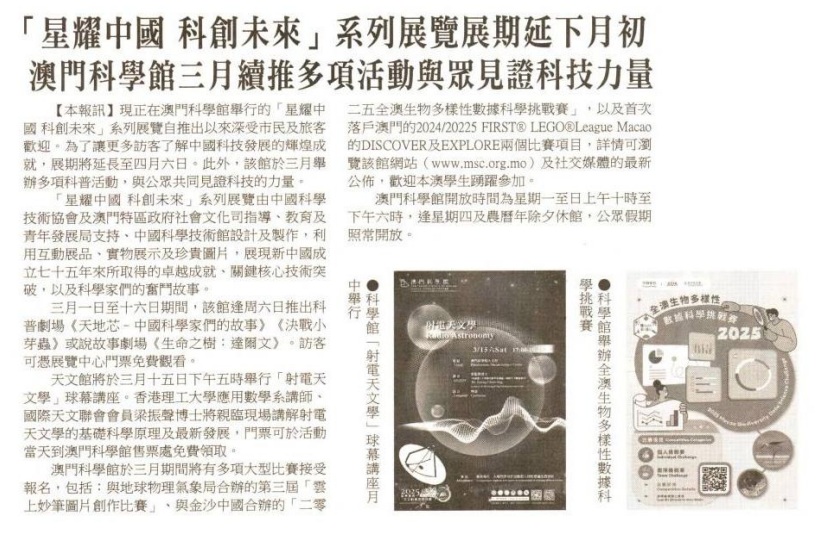 2025.02.28《華僑報》“星耀中國 科創未來”系列展覽展期延長至4月6日 澳門科學館3月續推多項活動與眾見證科技力量