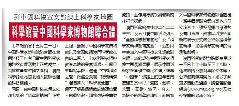 五⽉三⼗⽇,中國科學家博物館聯合體在全國科技⼯作者⽇暨中國科學家博物館⾸展活動上正式成⽴,⾸批成員單位隨之亮相,澳⾨科學館成為⾸批加⼊該聯合體的科技場館。