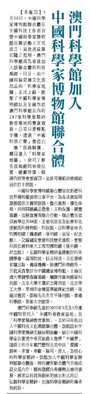 《新華澳報》澳⾨科學館加⼊ 中國科學家博物館聯合體