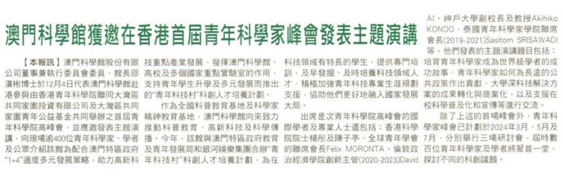《新華澳報》澳門科學館獲邀在香港首屆青年科學家峰會發表主題演講