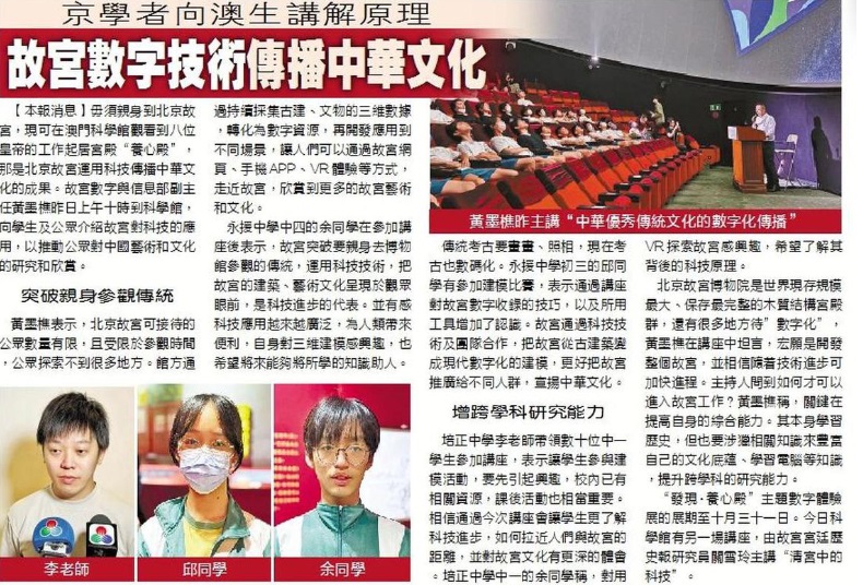 《澳門日報》京學者向澳⽣講解原理 故宮數字技術傳播中華⽂化