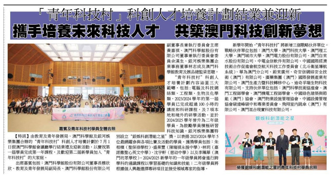 《現代澳⾨⽇報》「⻘年科技村」科創⼈才培養計劃圓滿結業迎新 攜⼿培養未來科技⼈才 共築澳⾨科技創新夢想