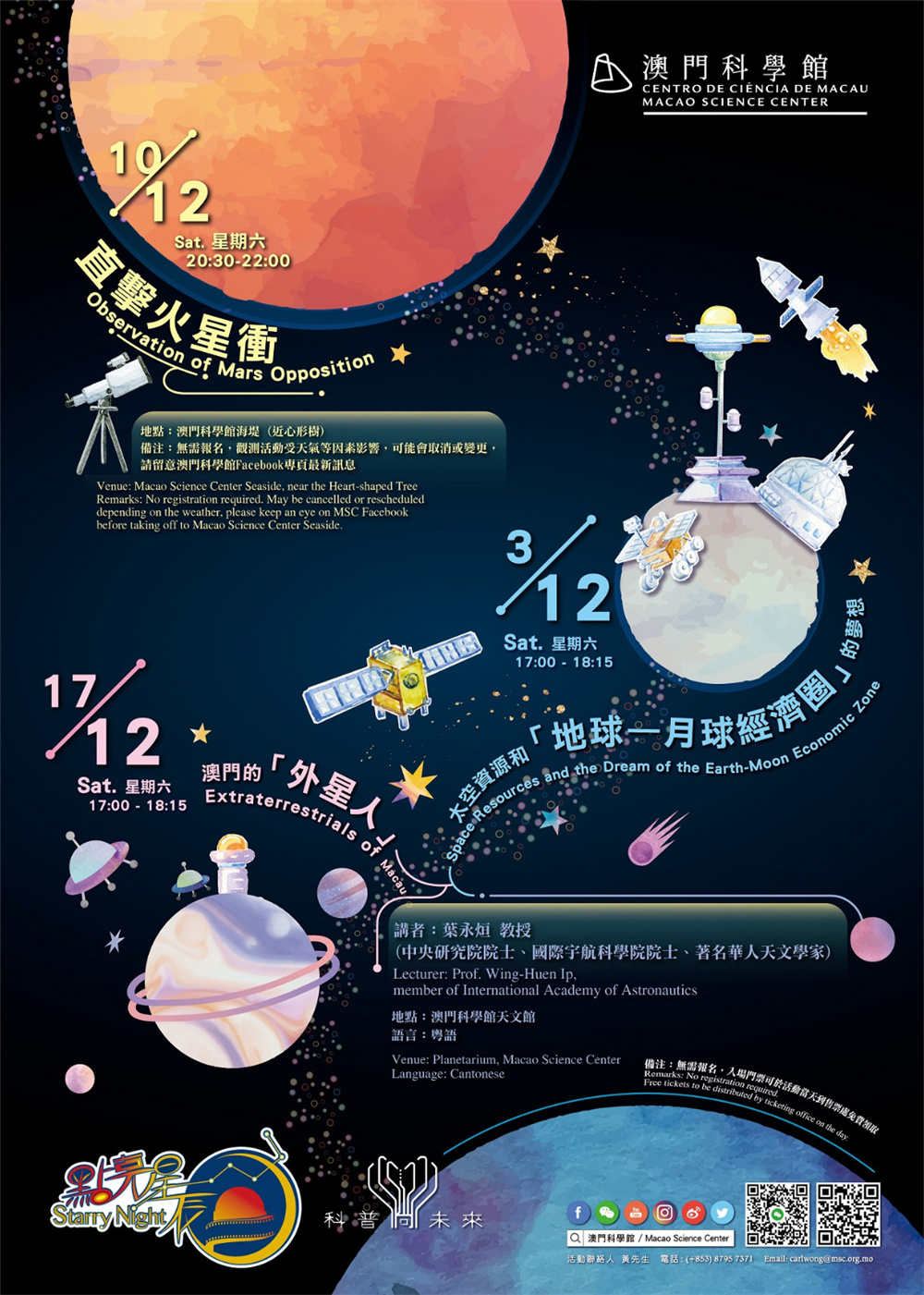 12月8日,澳門上空將會出現「火星衝」天文現象,當天火星、地球及太陽會連成一線,是火星最靠近地球和顯得最為明亮的時候,而火星衝發生前後的一個月內都是觀測火星的理想時間,本館將於12月10日舉行「點亮星辰:直擊火星衝」,除會設置兩座天文望遠鏡供公眾觀測火星外,更會安排工作人員在現場指導參加者操作天文望遠鏡及介紹相關天文知識。12月17日,葉永烜教授會再次以球幕線上連線方式,主講點亮星辰:澳門的「外星人」講座,與公眾探討系外行星與生物圈。