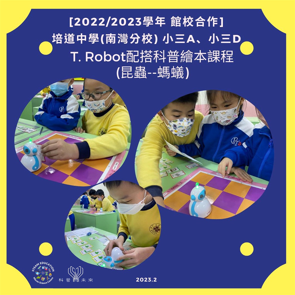 本館人員一連兩周到培道中學(南灣分校)為小三年級A,D班的學生提供T. Robot配搭科普繪本課程。同學們先透過螞蟻主題科普繪本故事認識螞蟻特性,再嘗試親自動手操作T.Robot,以闖關遊戲的方式為螞蟻尋找食物。