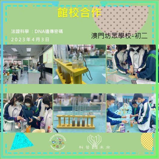 本館的科普講解員為澳門坊眾學校學生舉辦法證科學: DNA遺傳密碼課堂。DNA是法證科學領域的常客,化驗師經常會利用各種分子生物學技術去萃取證物上沾染的DNA。透過這次課堂,同學們便有機會嘗試進行DNA萃取實驗來窺探它的真面目。