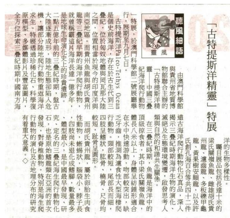 2025.04.29《澳門日報》中國三疊紀海洋爬⾏動物特展 "古特提斯洋精靈"科學館開幕