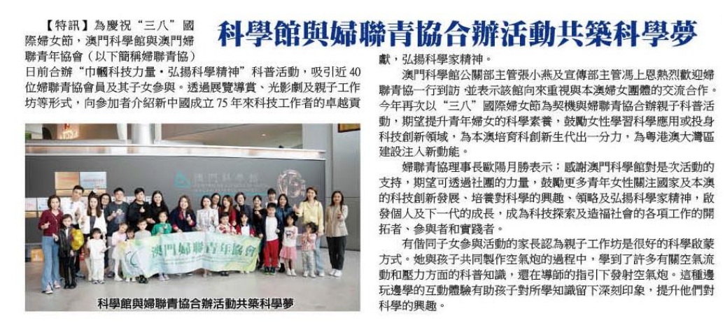 2025.03.07《現代澳門日報》科學館與婦聯青協辦活動 推動青年婦女共築科學夢