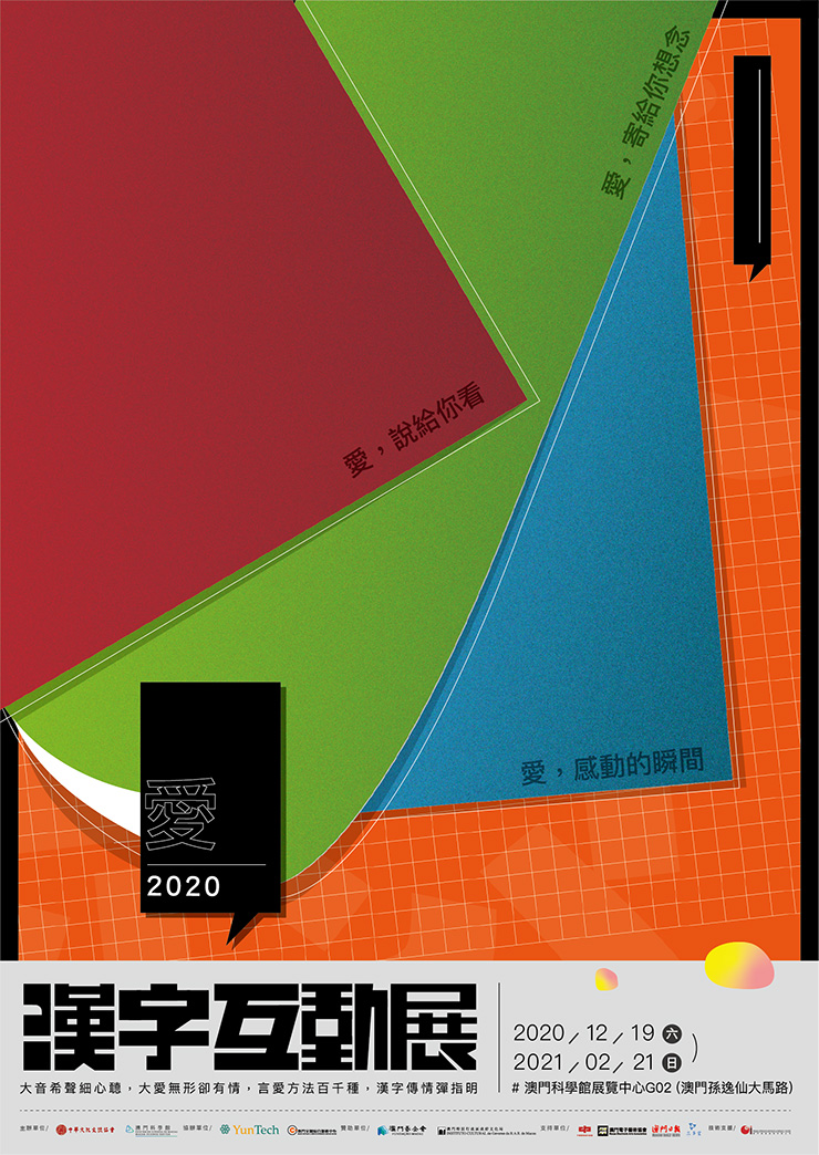 自古以來,文字傳遞了許多的訊息,功能性的表達,情感性的敘說,許多流傳千古至今的漢字,耐人尋味的是對於“愛”的傳達,這包含對於土地的愛、家人的愛、情人的愛、巧奪天工自然的愛、路邊小花驚喜的愛…….愛,讓這個世界更美好,而漢字是最好傳遞愛的文字,因此透過“口、手、心”的組合,讓愛傳遞出不同意義,愛—2020漢字互動展通過“愛,說給你看”、“愛,寄給你想念”、“愛,感動的瞬間”三個單元來展示“愛”的不同方式。
