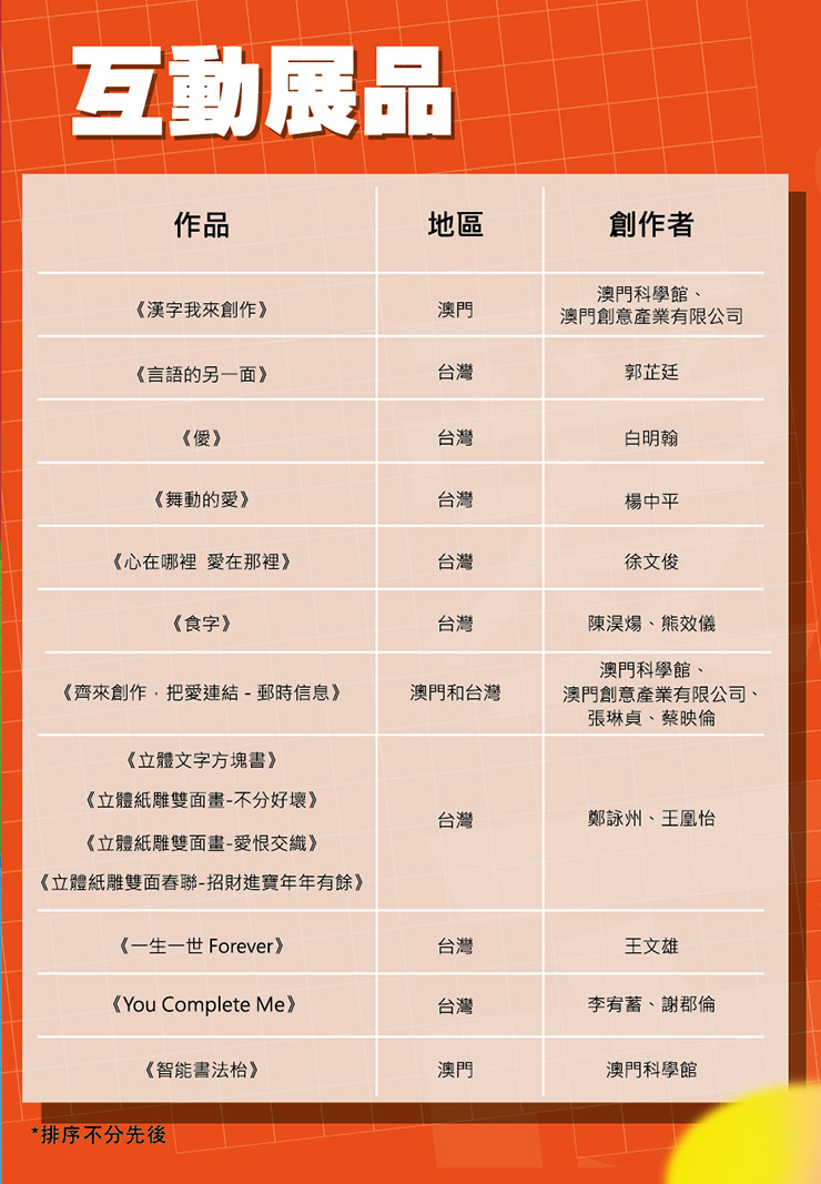 11組展品(3組澳門,8組台灣,15個創作者)