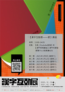 “2020漢字互動展——愛” 延伸活動:創作分享講座 | 互動多媒體、跨界藝術是新興的藝術與設計形態,是次“2020漢字互動展——愛”邀請了澳門、台灣創作者以漢字為主題進行創作,形式多樣、創新。 為讓大眾可以與創作者互相交流,了解更多創作背後的發想、意念、研發過程等,主辦單位將舉辦6場創作分享講座,邀請9個參展創作單位,分享其創作的心路歷程及展品的深度解說。 講座將於2021年1月9日至24日13:00線上線下同步舉行,歡迎有興趣人士報名參加。 第四場:2021年1月17日 (星期日) 第五場:2021年1月23日 (星期六) 第六場:2021年1月24日 (星期日) 地點:【線上Youtube直播】或【澳門現場講座】澳門科學館展覽中心5號展廳G05(澳門孫逸仙大馬路) | |