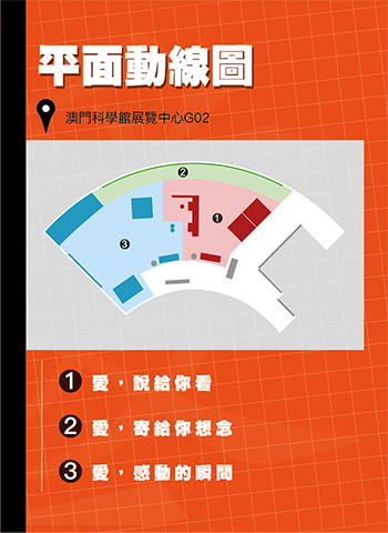 | 子題一:愛,說給你看 “愛你在心口難開”、“愛,只能意會不能言傳”,這似乎是華人們說愛的一種方法,因此本子題中,透過趣味與互動的方式,透過口說與自行即時回饋的互動形式,讓愛說的出口,也能被看得到。 子題二:愛,寄給你想念 澳門郵政系統發展甚早,在全球的郵政中,其中的郵票設計更是極具特色且是收藏家們珍藏的重點。而愛向來就需要一份珍藏,因此在本系統中,以平面設計的方式,以澳門郵政為基本架構,設計師選擇現存郵票的版型,透過方寸之間的郵票設計,傳遞愛的訊息。 子題三:愛,感動的瞬間 看到花開的那一瞬間,是驚喜。看到天邊彩虹的那一瞬間,是驚喜。聽到愛與被愛的瞬間,也有一股暖暖的驚喜。透過愛,在驚喜與感動的瞬間總具有化作永恆的魔力,在本子題中,透過各種互動的方式來傳遞愛在感動的瞬間。 | ![]() |