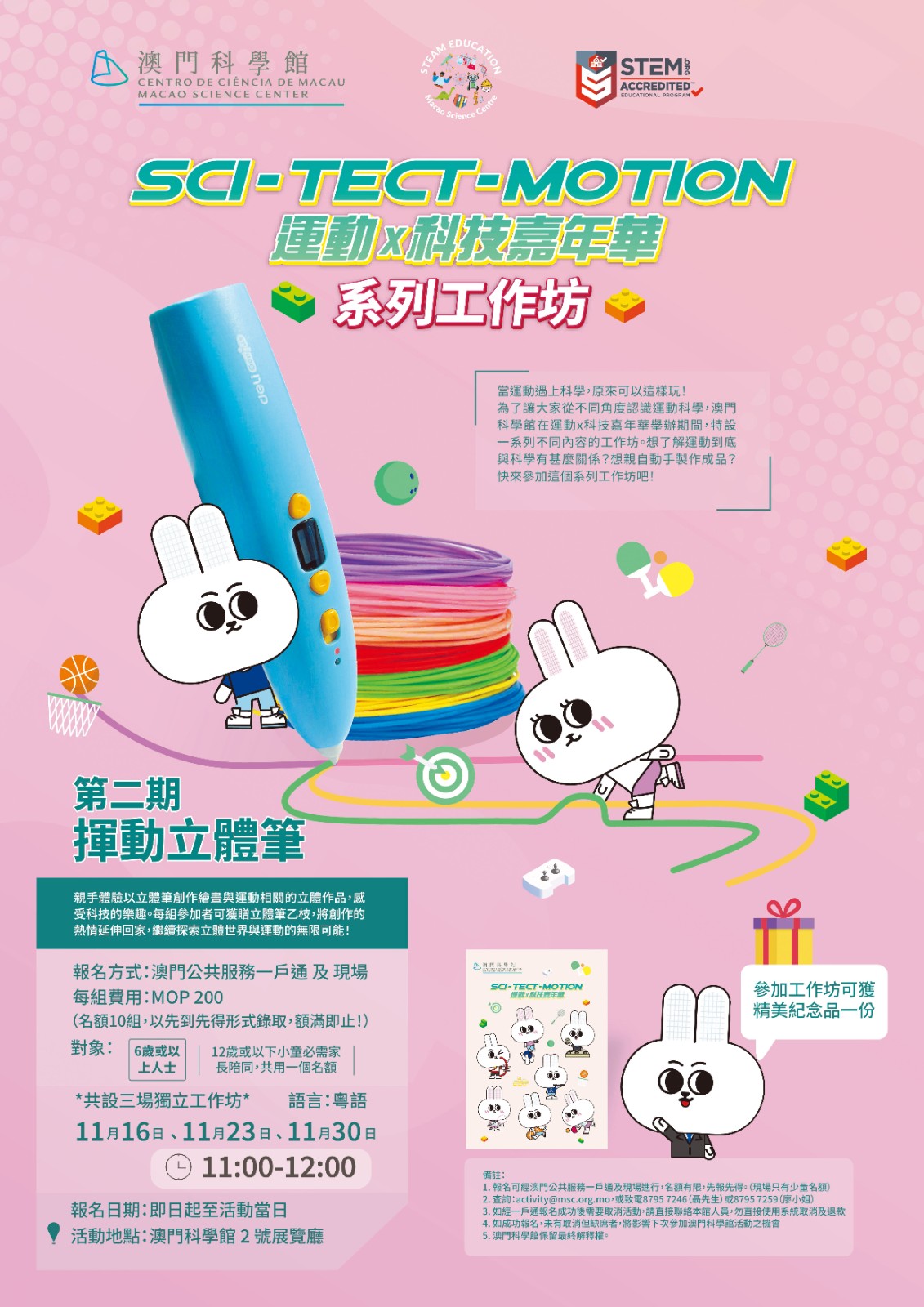 為了讓大家從不同角度認識運動科學,澳門科學館在運動x科技嘉年華舉辦期間,特設一系列不同內容的工作坊。想了解運動到底與科學有甚麼關係?想親自動手製作成品?快來參加這個系列工作坊吧!