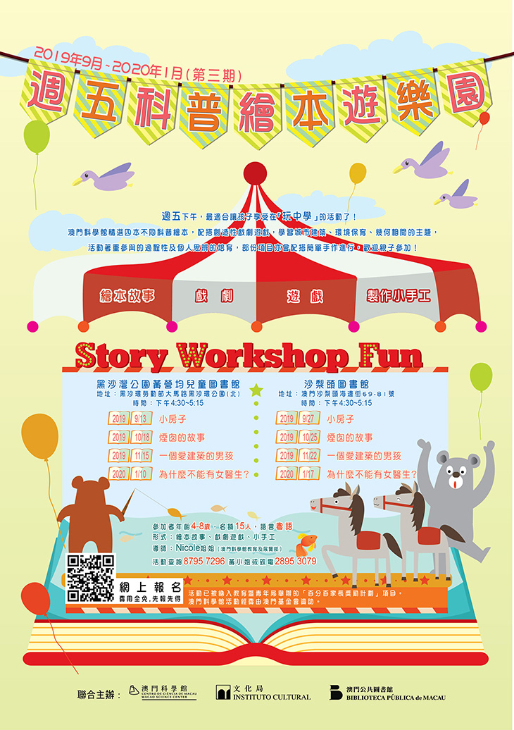 澳門科學館特備了四本不同科普繪本,配搭創造性戲劇遊戲,學習城市建築、環境保育、幾何相關的主題,活動著重參與的過程性及個人思辨的培育,部份項目亦會配搭簡單手作進行,歡迎親子參加!