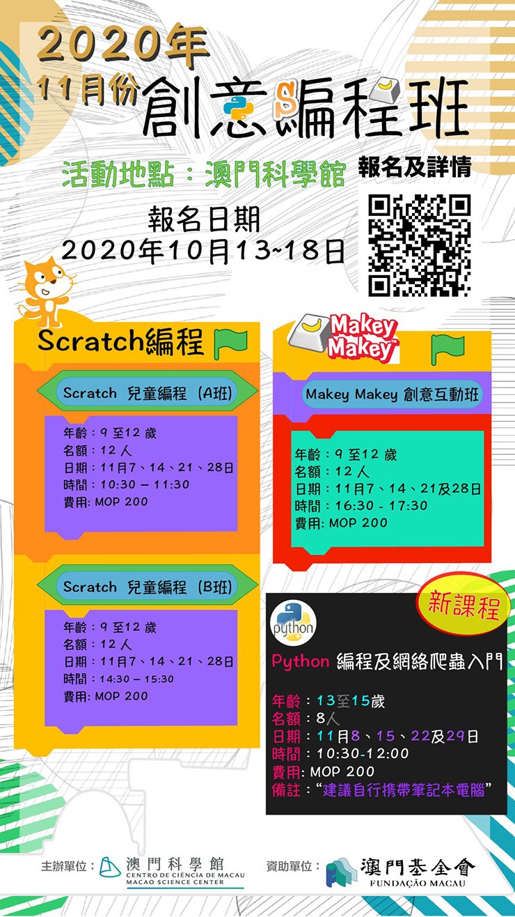 Scratch兒童編程B班 年齡:9 -12 歲 名額:12 人 日期:11月7、14、21及28日 時間:14:30 – 15:30 費用: MOP 200 | Python 編程及網絡爬蟲入門 年齡:13至15歲 名額:8人 日期:11月8、15、22及29日 時間:10:30-12:00 費用: MOP 200 備註:建議自行携帶筆記本電腦 |