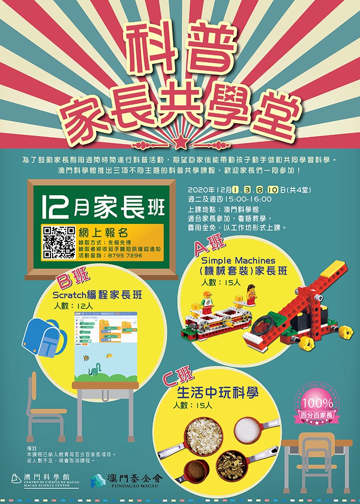 為了鼓勵家長利用周間時間進行科普活動,期望回家後能帶動孩子動手做和共同學習科學。澳門科學館推出四項不同主題的科普共學課程,歡迎家長們一同參加!