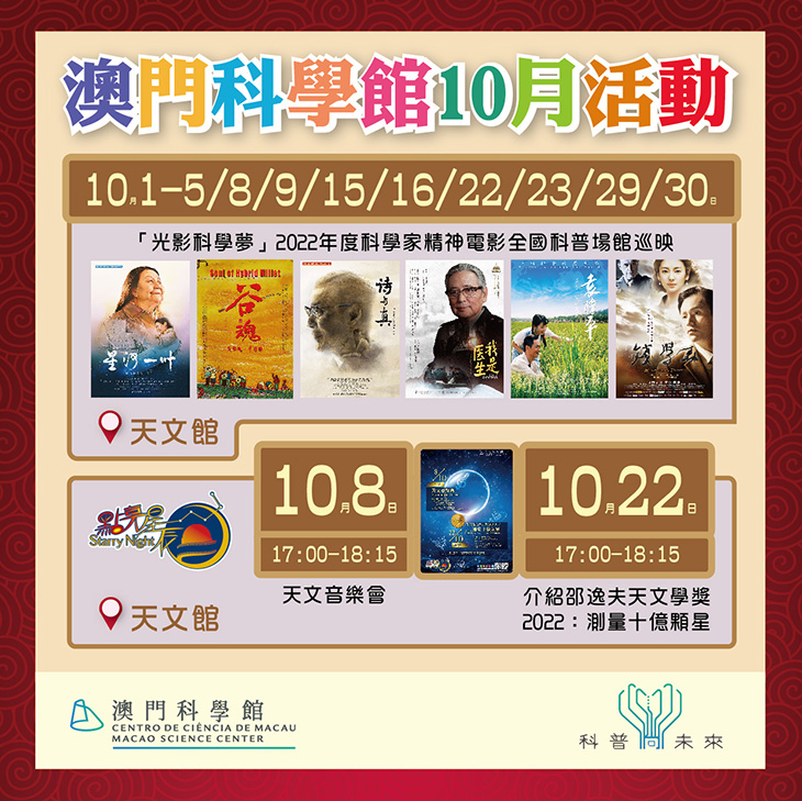 簡介 | 為慶祝中華人民共和國成立73周年,澳門科學館將一如以往於國慶節當日提供展覽中心免費入場。除了「光影科學夢」2022年度科學家精神電影外,10月1日天文館其餘每場球幕節目的首30位觀眾亦可憑澳門居民身份證獲取免費門票。 |