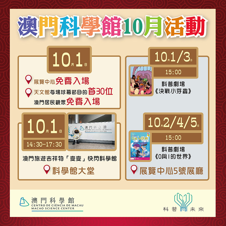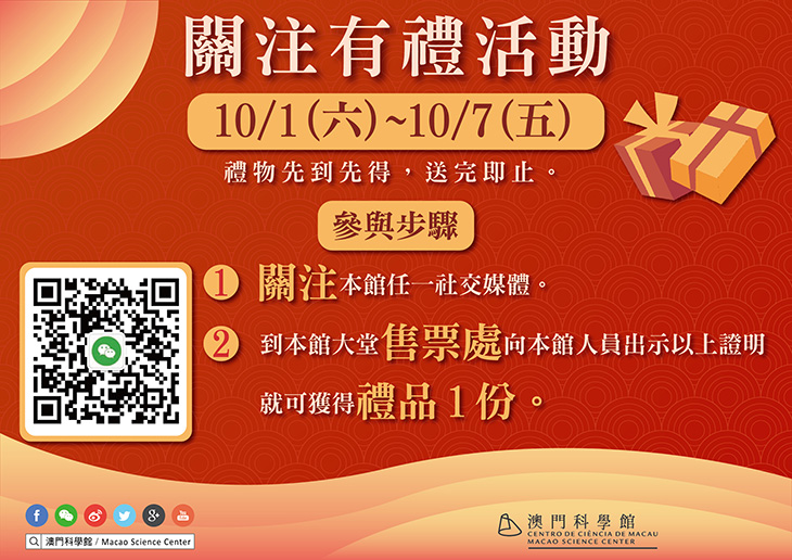 10月1日至7日 | 關注澳門科學館任一社交平台的訪客,可向售票處工作人員展示後獲贈紀念品乙份 | 科學館 售票處 |
