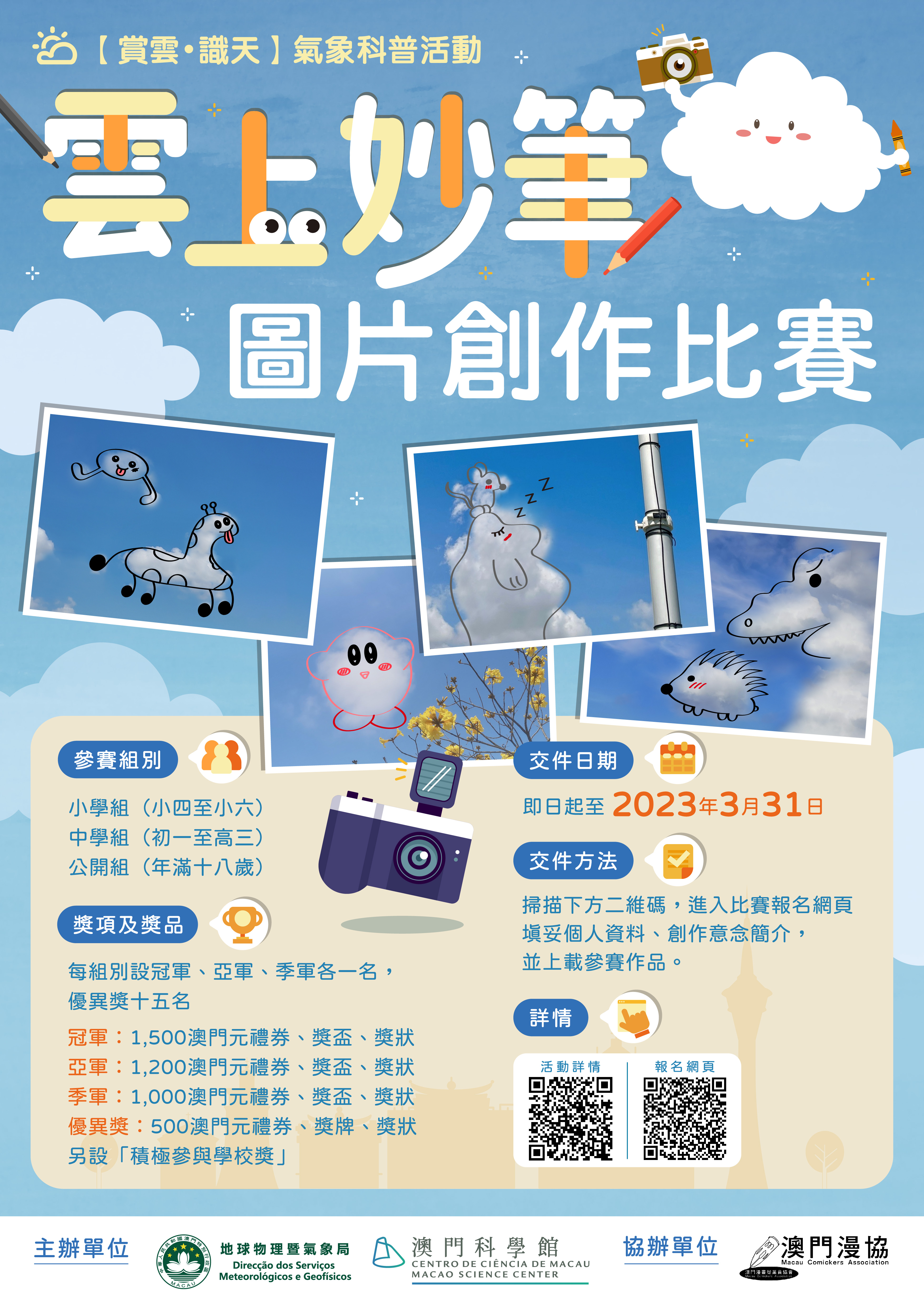 為推動氣象科普教育,地球物理暨氣象局與澳門科學館合辦「【賞雲.識天】氣象科普活動」,冀提升不同年齡層的市民對天氣情況的關注和認識,進一步向公眾普及氣象知識。是次活動包括以下兩項科普比賽,歡迎合資格人士踴躍參與。