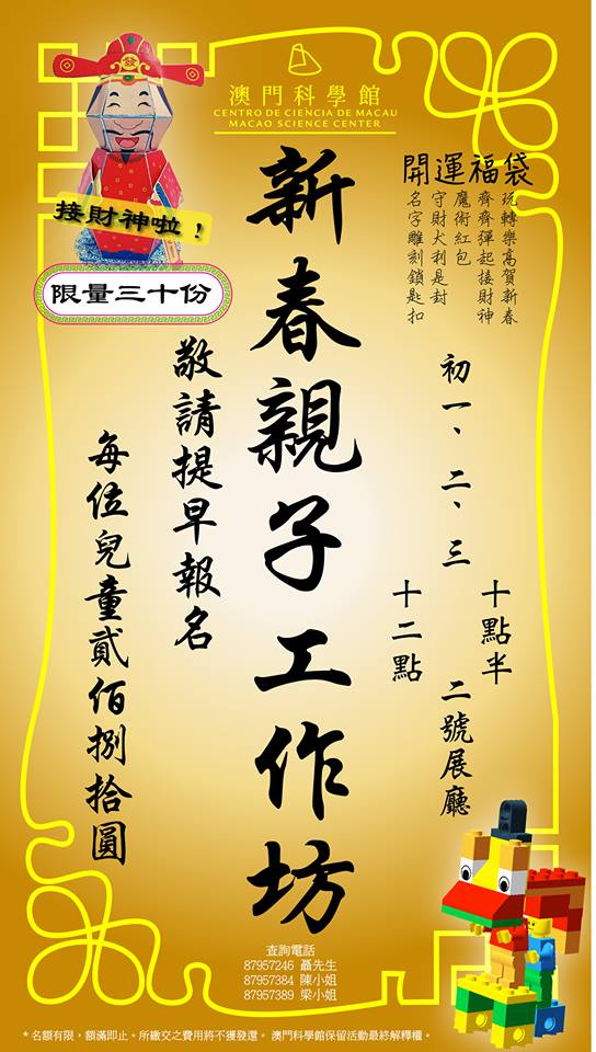 ◆費用:每名兒童澳門幣 280元(費用已包括1位兒童及1位家長之門票、工作坊所有材料及開運福袋)**