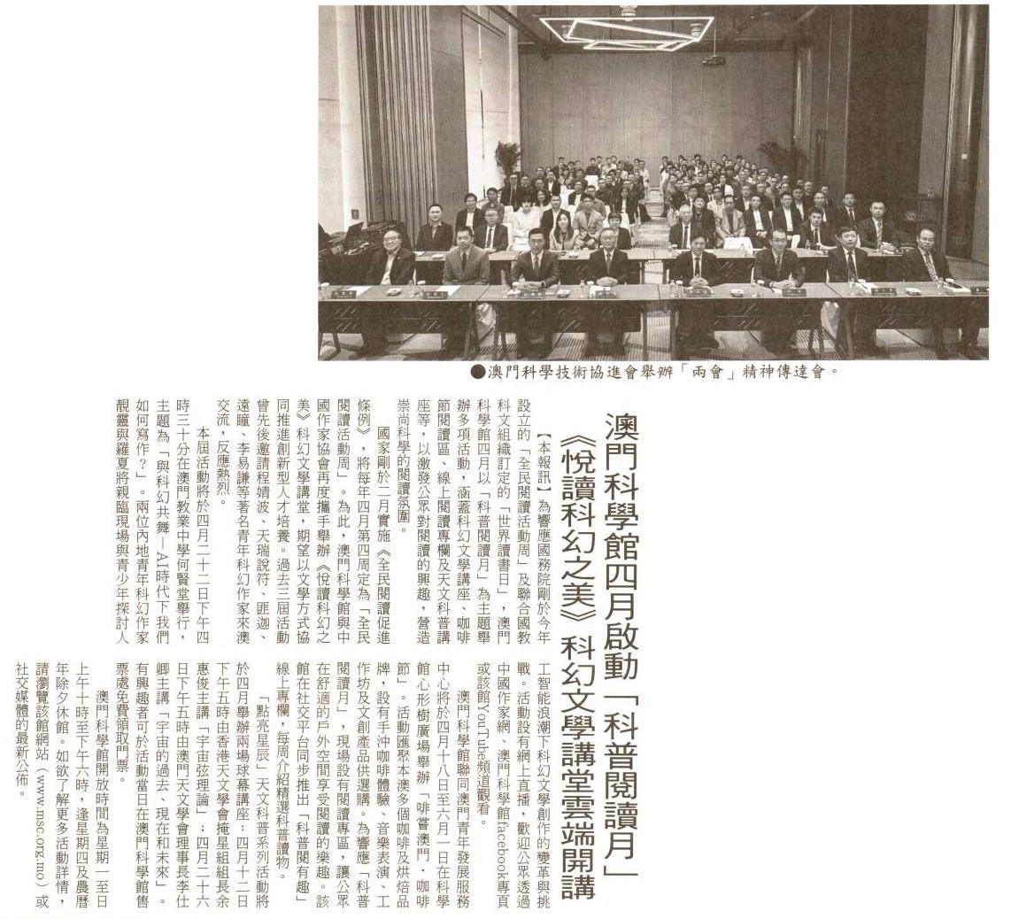 2026.4.11 《現代澳門日報》澳門科學館四月啟動「科普閱讀月」 《悅讀科幻之美》科幻文學講堂雲端開講