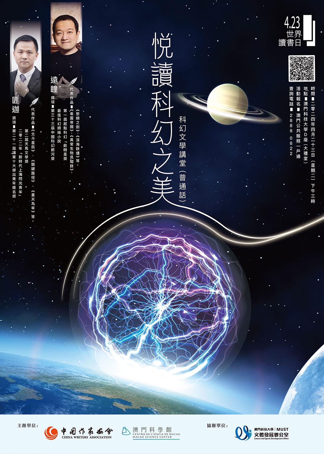 由中國作家協會與澳門科學館共同主辦、澳門科技大學文體發展辦公室協辦之“悅讀科幻之美”科幻文學講堂將於世界讀書日(4月23日)下午3時在澳門科技大學D座大禮堂舉行。兩位內地80後著名青年科幻文學作家匪迦、遠瞳將分享其創作經歷、中國科幻文學現狀、引領大家感受科技與文化交融的魅力,共同探索現實與想像之間的理想平衡。這是中國作家協會與澳門科學館第二次攜手合辦科幻文學大講堂,去年活動成功舉辦,吸引眾多年青人到場、參與者均表示這樣的活動不但拓寬了他們對科普領域的認知,並且能激發人們對未來的想像、燃點對科技領域的熱情。