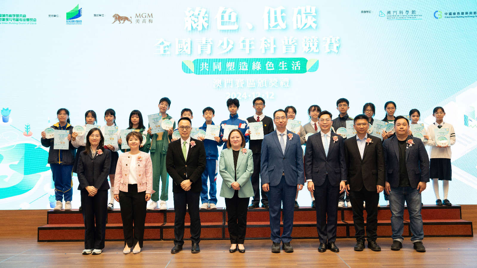 出席“綠色、低碳全國青少年科普競賽–共同塑造綠色生活”澳門區選拔賽頒獎禮的嘉賓還包括:美高梅人力資源執行副總裁余婉瑩、美高梅人力資源及可持續發展高級副總裁李建恆、澳門科學館設施管理及可持續發展部主管章劍峰、美高梅可持續發展及整合助理副總裁柯學明、澳門科技大學人文藝術學院建築學課程主任鄭劍藝副教授及香港科技大學(廣州)科研建設與發展處處長楊晶博士等。如欲查閲“綠色、低碳全國青少年科普競賽–共同塑造綠色生活”澳門區選拔賽的得獎名單,請瀏覽澳門科學館網站(www.msc.org.mo)。