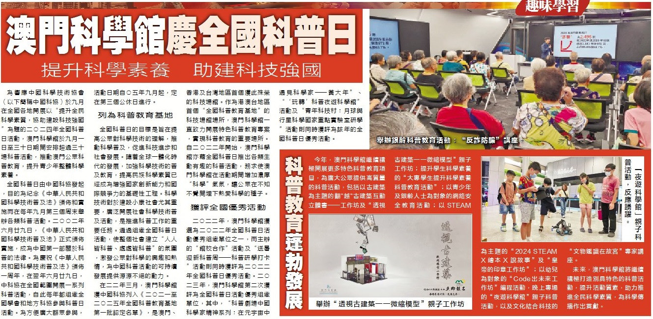 澳⾨科學館慶全國科普⽇ 提升科學素養 助建科技強國