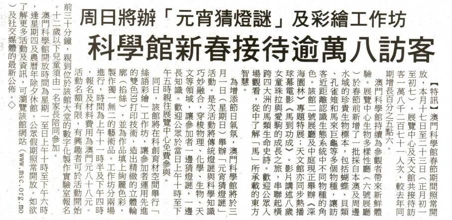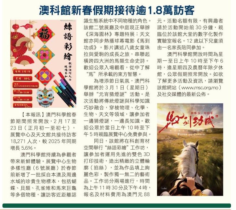 2026.2.26《澳門時報》澳科館新春假期接待逾1.8萬訪客