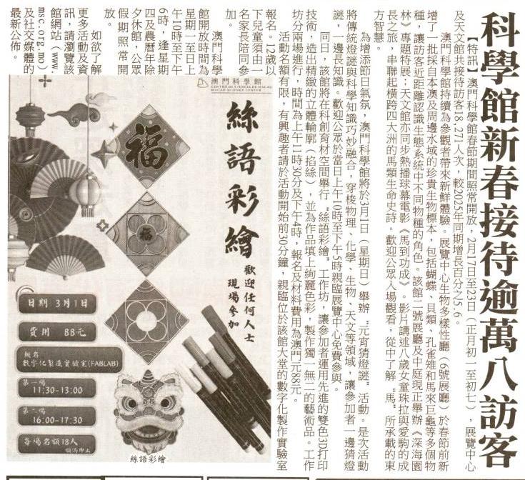 2026.2.26《華僑報》周日將辦「元宵猜燈謎」及彩繪工作坊 科學館新春接待逾萬八訪客