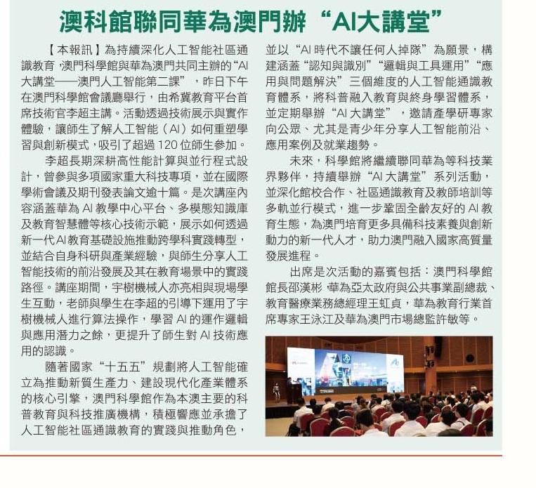 2026.04.29《市民日報》科學館聯同華為澳門舉辦“AI大講堂”
