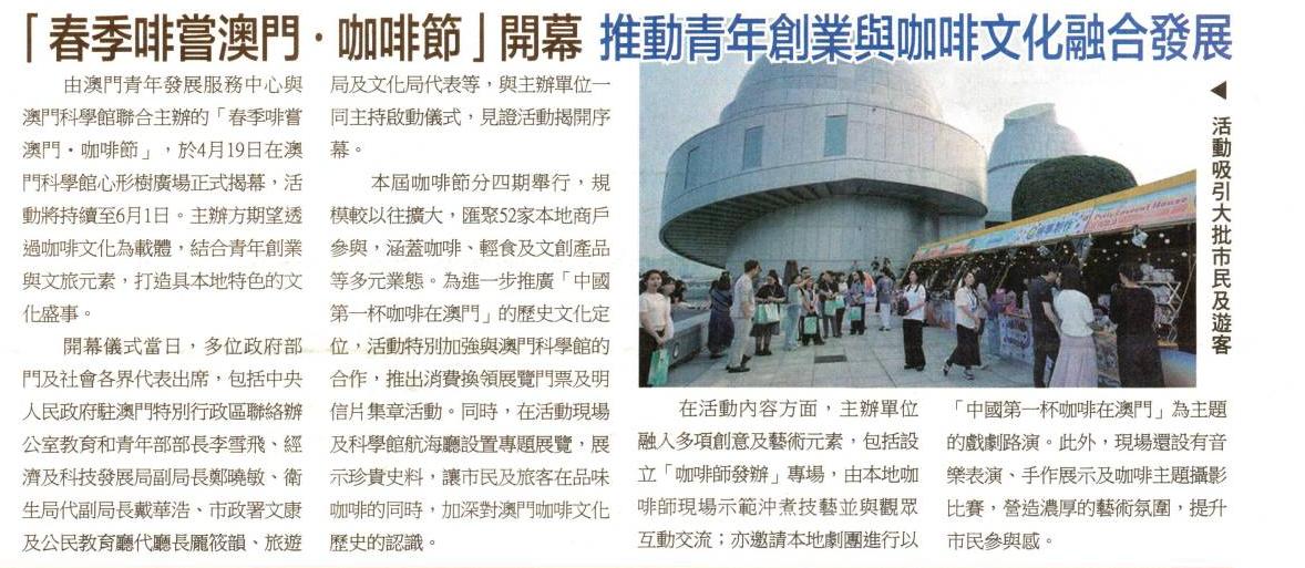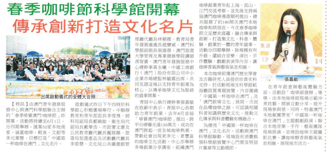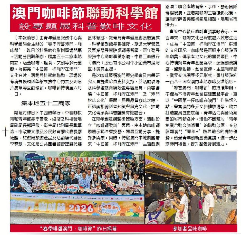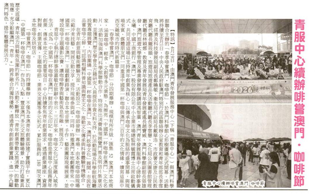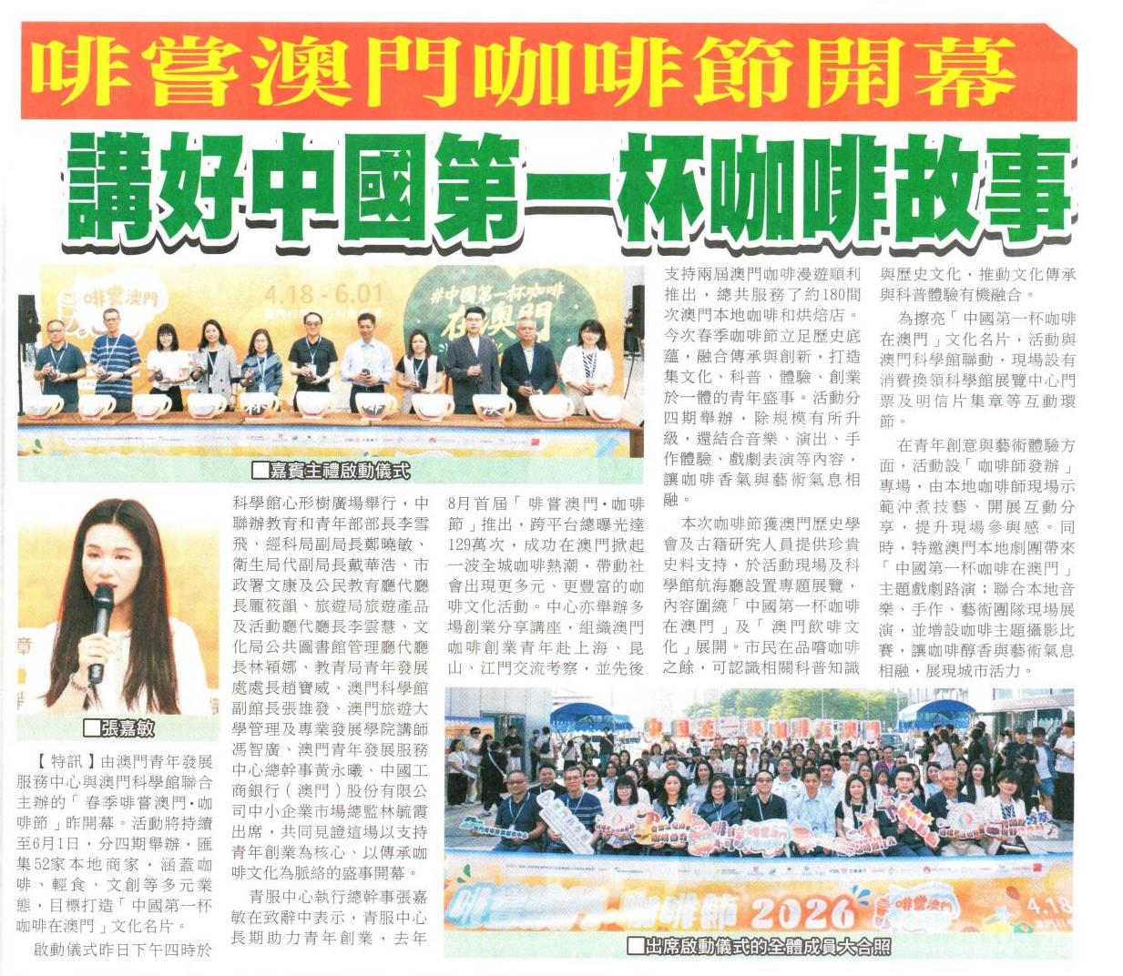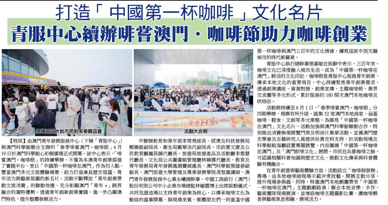 2026.04.20 《市民日報》打造「中國第一杯咖啡」文化名片 青服中心續辦啡嘗澳門·咖啡節助力咖啡創業