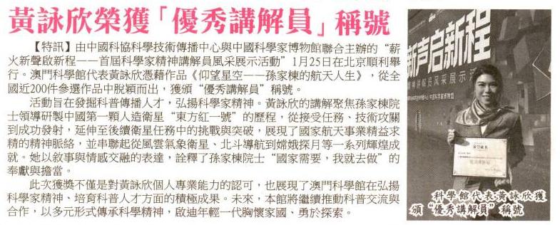 2026.2.11《澳門會展經濟報》科學館代表黃詠欣榮獲全國科學家精神“優秀講解員”稱號