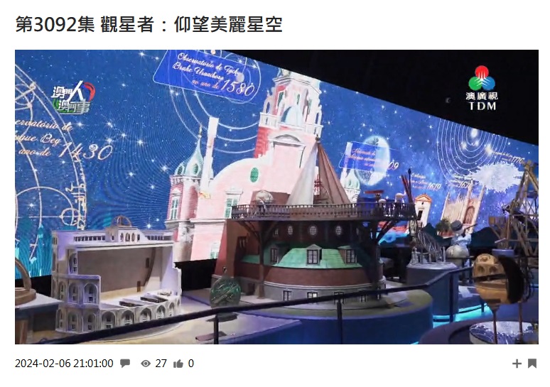從古到今,觀星者都在追逐星空、宇宙的路上竭力前行。始於好奇和敬畏,人類積極探索天體與時空之間的規律,甚至以數學、幾何、物理的語言,理性探索人類所處的世界。澳廣視最新一集《澳門人‧澳門事》向觀眾介紹科學館新展廳"觀星者",展廳以各個時代的觀星者為線索,融合藝術與科技,帶領觀眾了解神秘星空背後的故事,探索宇宙的奧秘。