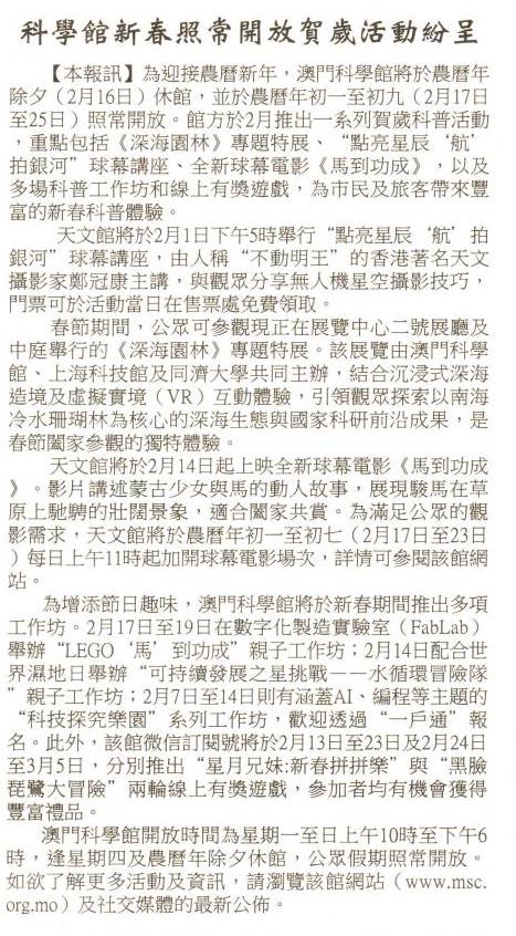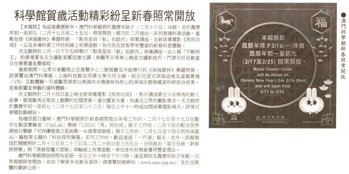 2026.1.31《現代澳門日報》科學館賀歲活動精彩紛呈新春照常開放