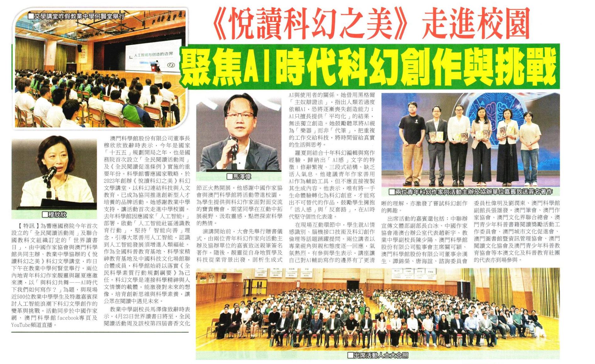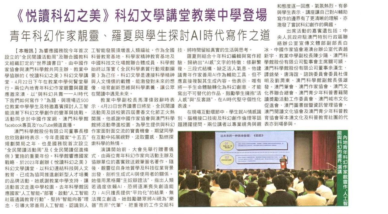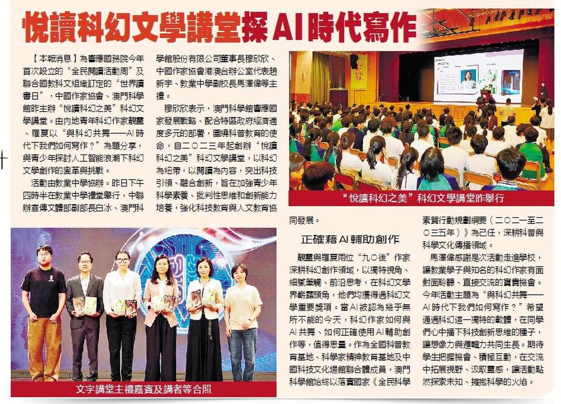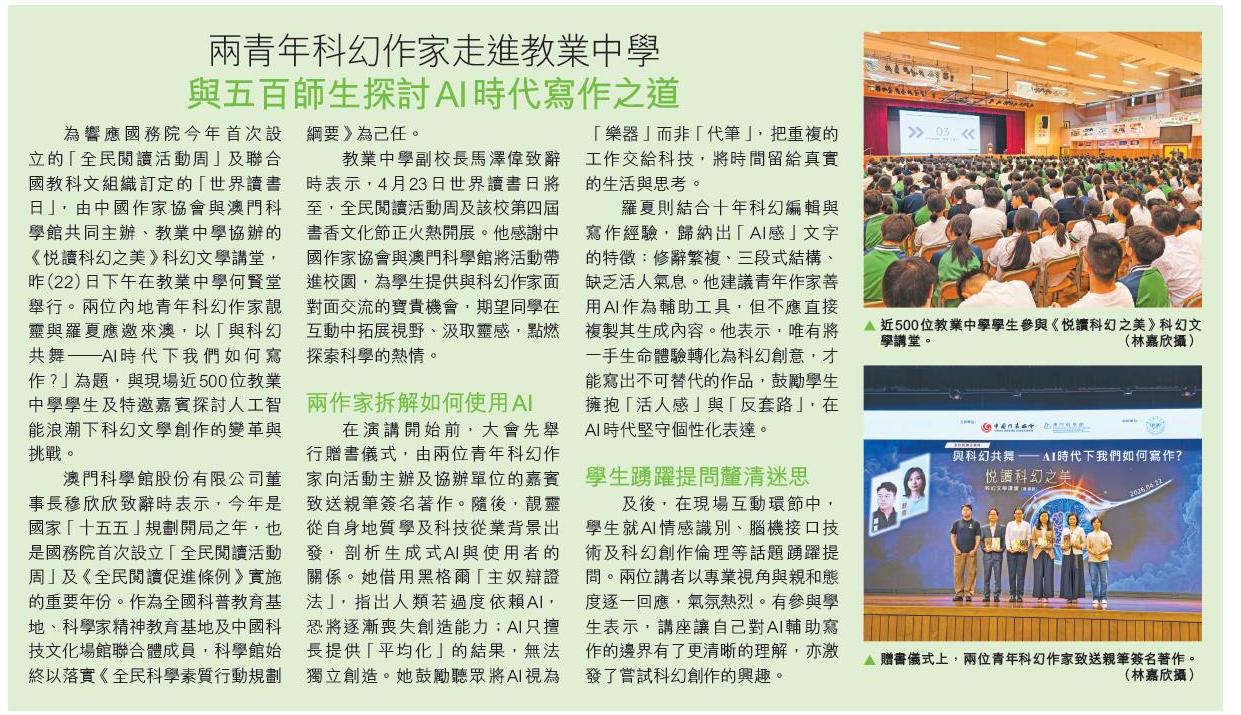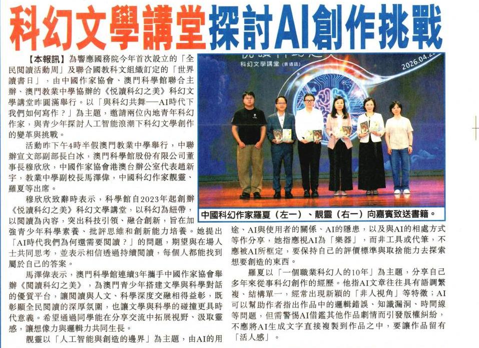 2026.04.23 《濠江日報》《悅讀科幻之美》走進校園 聚焦AI時代科幻創作與挑戰