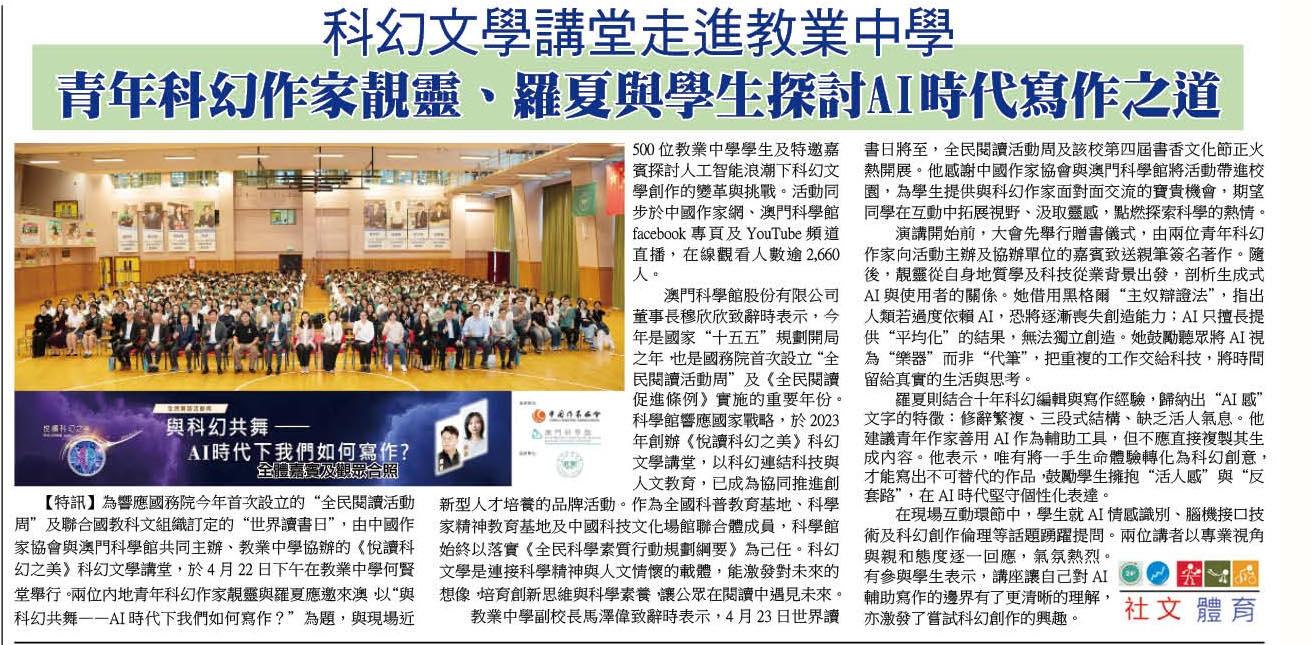 2026.04.23 《澳門會展經濟報》《悅讀科幻之美》科幻文學講堂教業中學登場 青年科幻作家靚靈、羅夏與學生探討AI時代寫作之道