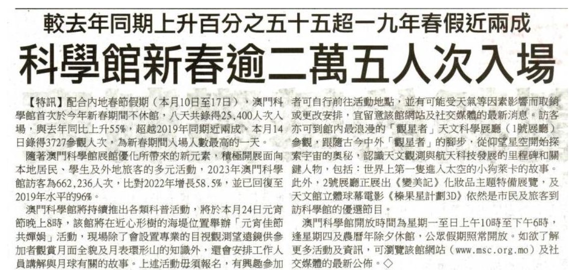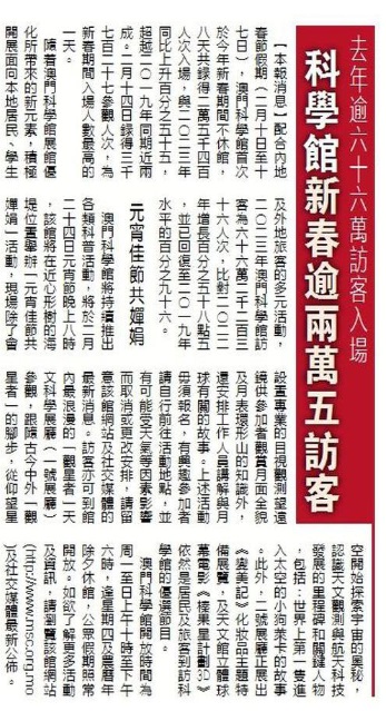 《澳門日報》去年逾六⼗六萬訪客⼊場 科學館新春逾兩萬五訪客
