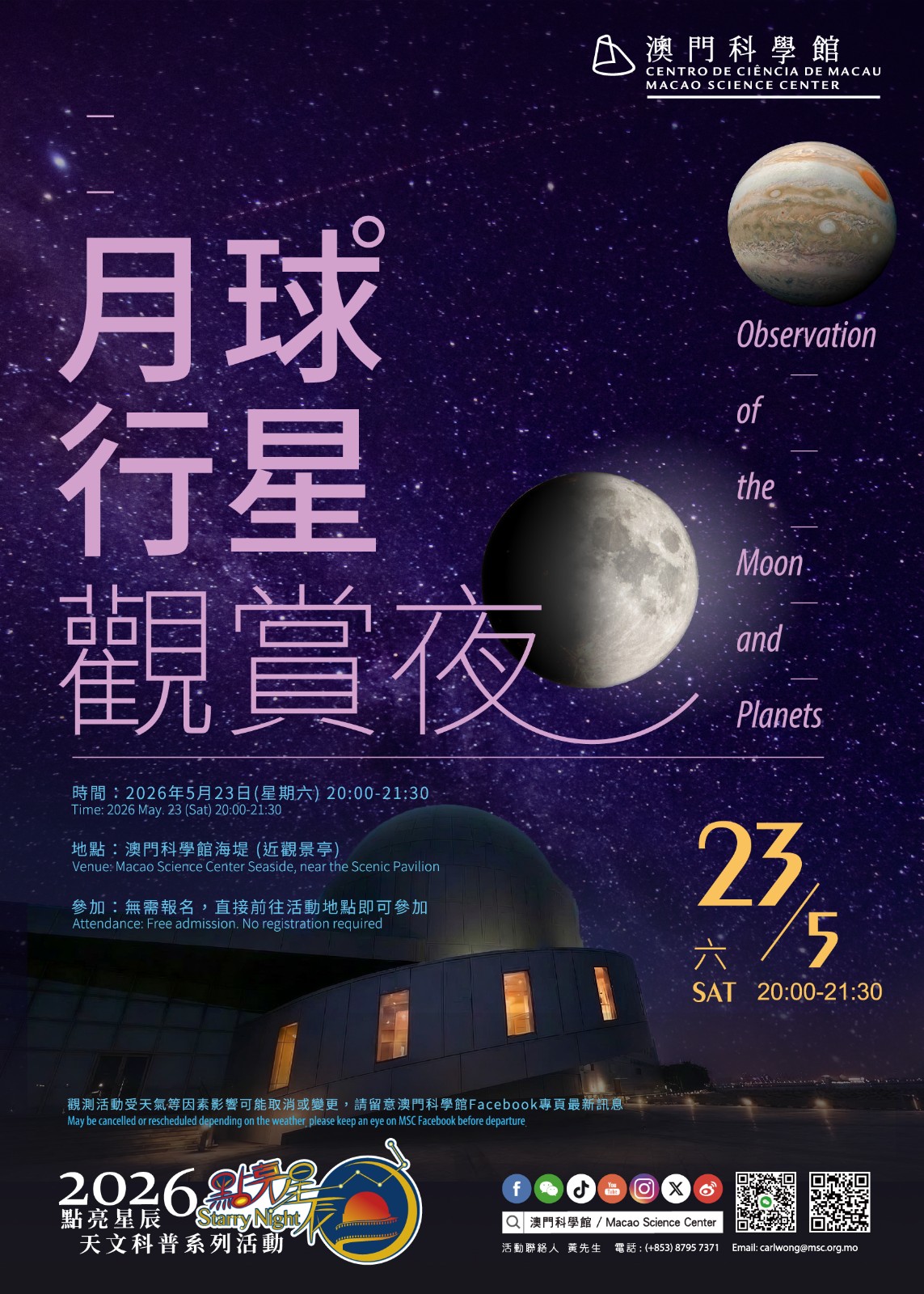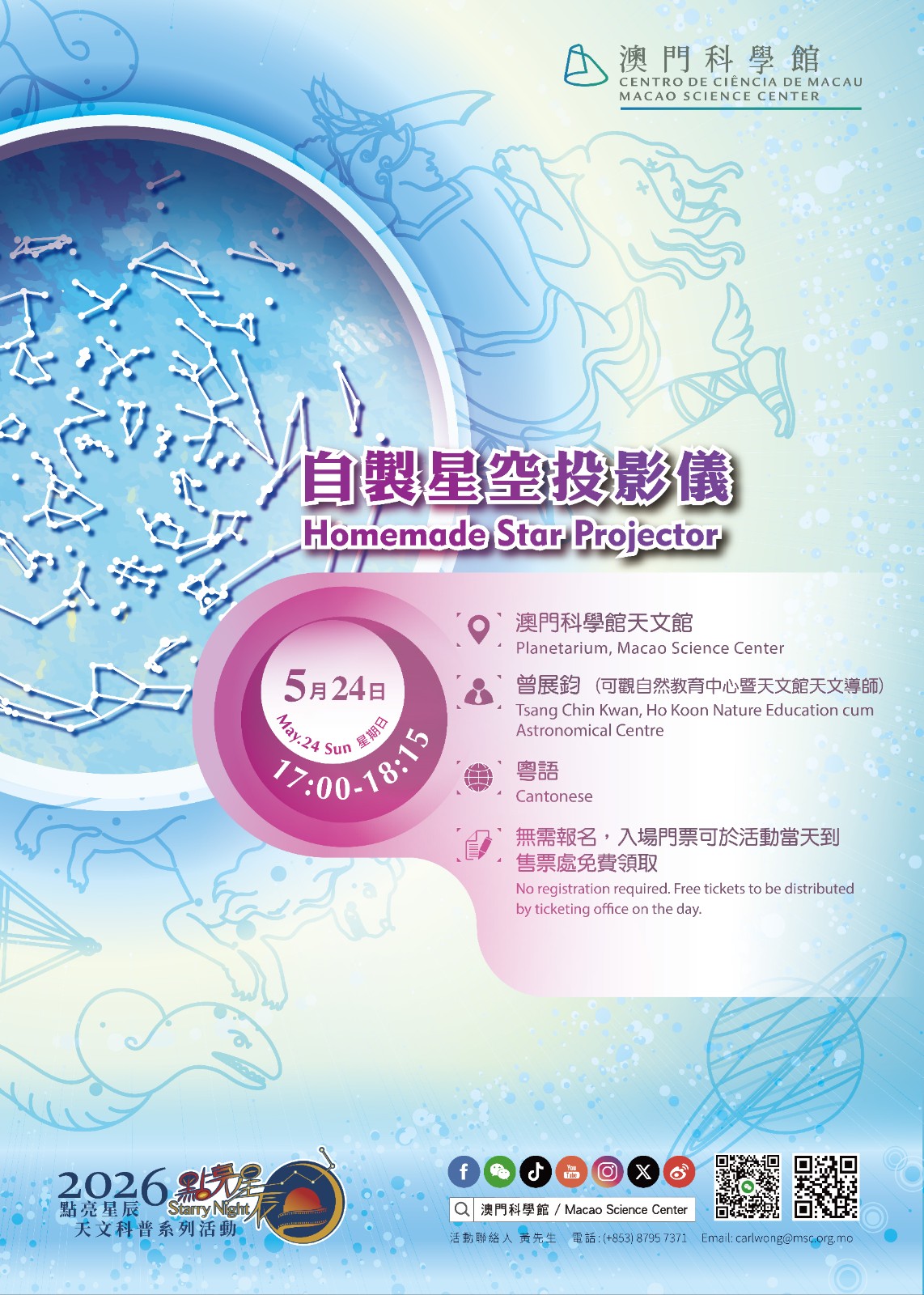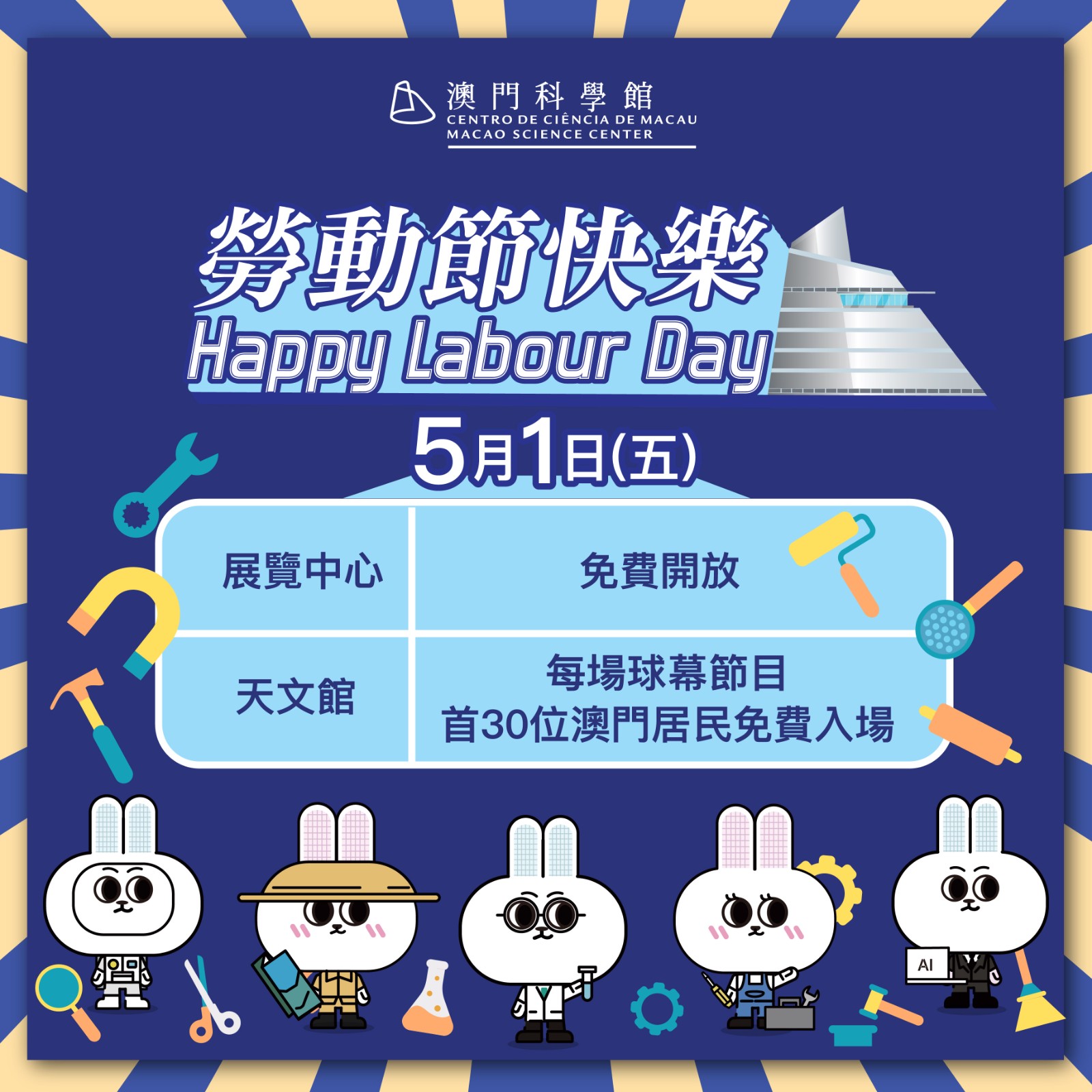 為提升全民科學素養,澳門科學館於 5 月繼續舉辦系列科普活動,涵蓋社區推廣、人工智能培訓、天文科普及文化體驗等。澳門科學館展覽中心於國際勞動節(5 月 1 日)及國際博物館日(5 月 18 日)免費開放,同時,5 月 1 日天文館每場球幕節目的首 30 位觀眾可憑澳門居民身份證免費入場。