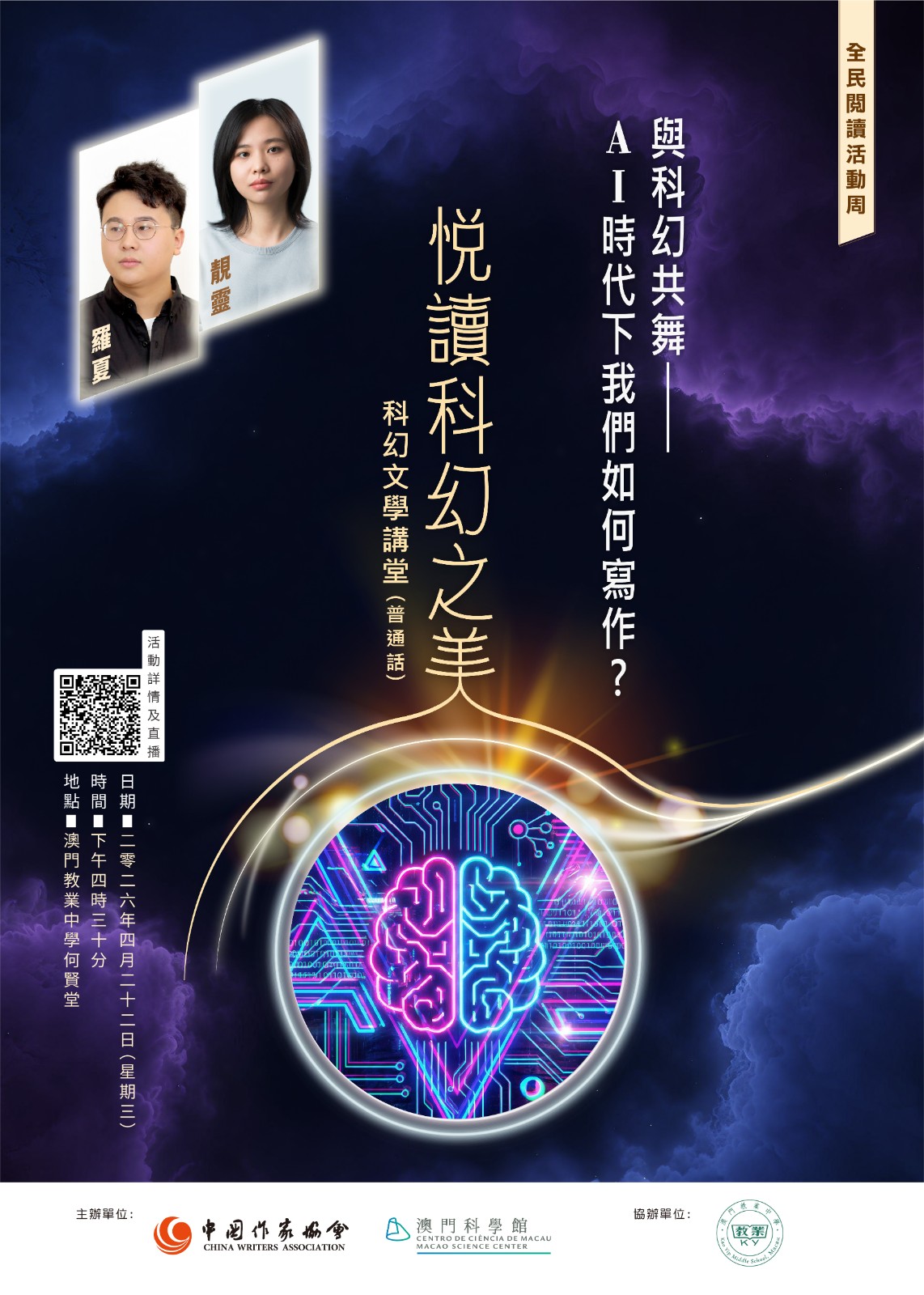 本屆活動將於4月22日下午4時30分在澳門教業中學禮堂舉行,主題為“與科幻共舞——AI時代下我們如何寫作?”。兩位內地青年科幻作家靚靈與羅夏將親臨現場與青少年探討人工智能浪潮下科幻文學創作的變革與挑戰。活動設有網上直播,歡迎公眾透過中國作家網、澳門科學館facebook專頁或本館YouTube頻道觀看。