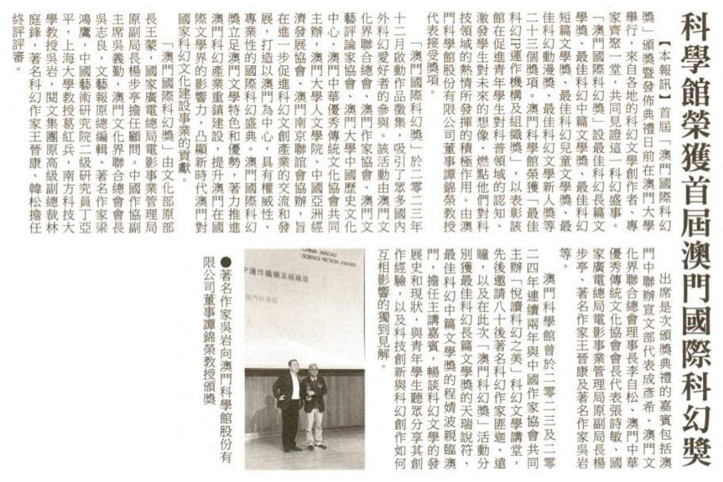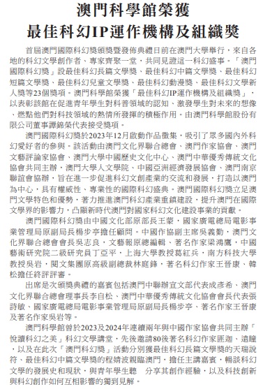 【媒體報導】科學館榮獲首屆澳門國際科幻獎