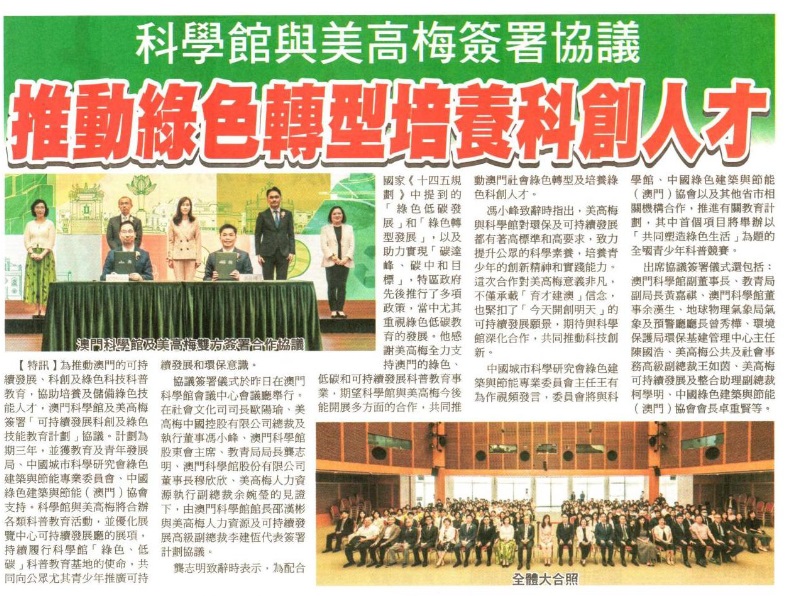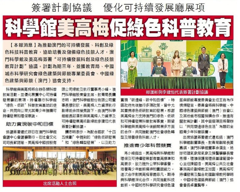 《大眾報》科學館與美⾼梅簽署協議 推動綠⾊轉型培養科創⼈才