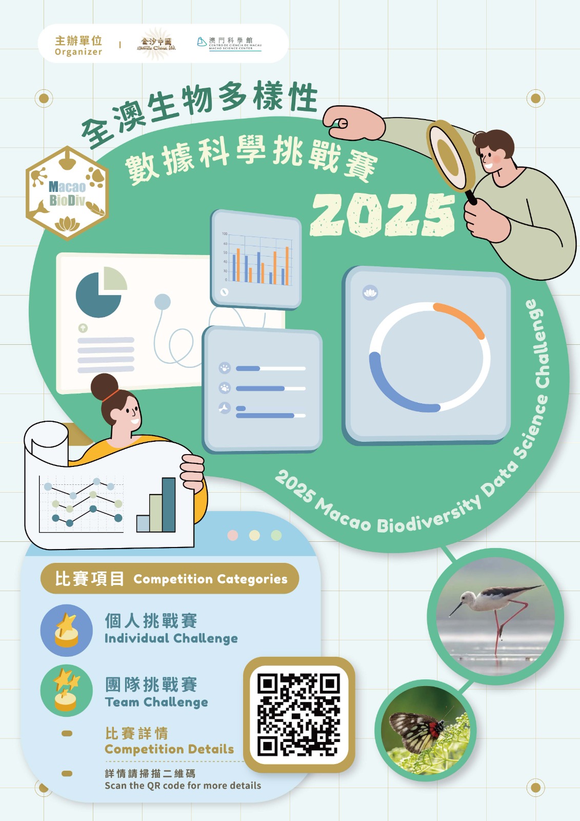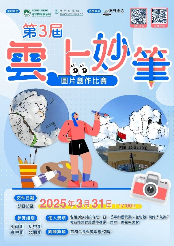澳門科學館於3月期間將有多項大型比賽接受報名,包括:與地球物理氣象局合辦的第三屆“雲上妙筆圖片創作比賽”、與金沙中國合辦的“2025全澳生物多樣性數據科學挑戰賽”,以及首次落戶澳門的2024/20225 FIRST® LEGO® League Macao的DISCOVER及EXPLORE兩個比賽項目,詳情可瀏覽本館網站(www.msc.org.mo)及社交媒體的最新公佈,歡迎本澳學生踴躍參加。