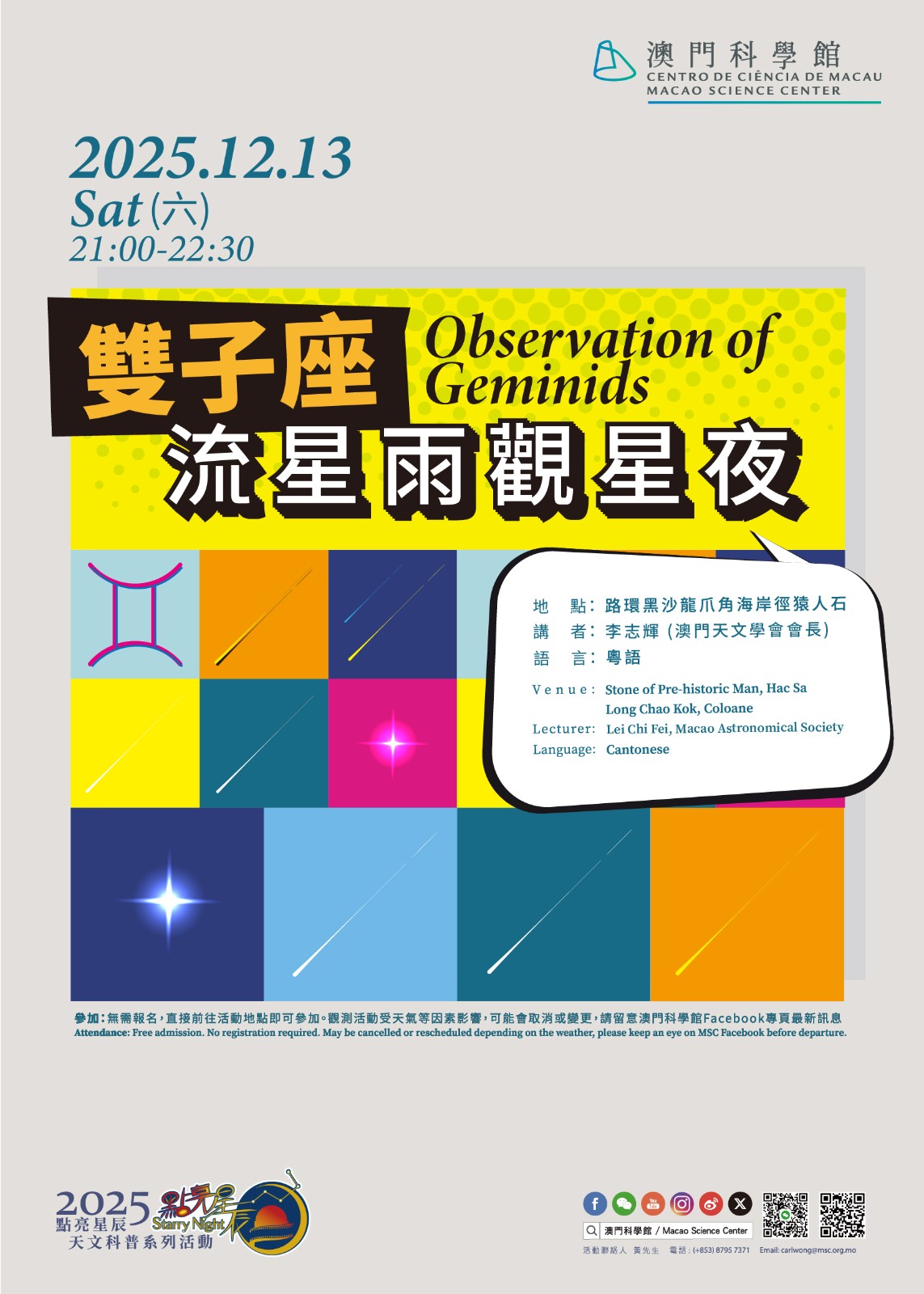 為滿足節假日觀影需求,天文館將於12月20日至27日期間加開球幕場次。此外,12月13日晚上9時,科學館將於路環黑沙龍爪角海岸徑舉辦「雙子座流星雨觀星夜」,由澳門天文學會會長李志輝指導公眾使用望遠鏡觀測雙子座流星雨,並講解天文知識。